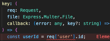 key의 req 파라미터를 보면 타입이 Request이다. 이 Request는 express 라이브러리에서 제공하는 타입이다. 그리고 함수 내부에서 userId를 req 변수의 user에서 id를 가져오는 부분이 있는데 이 부분이 지금 문제다!
