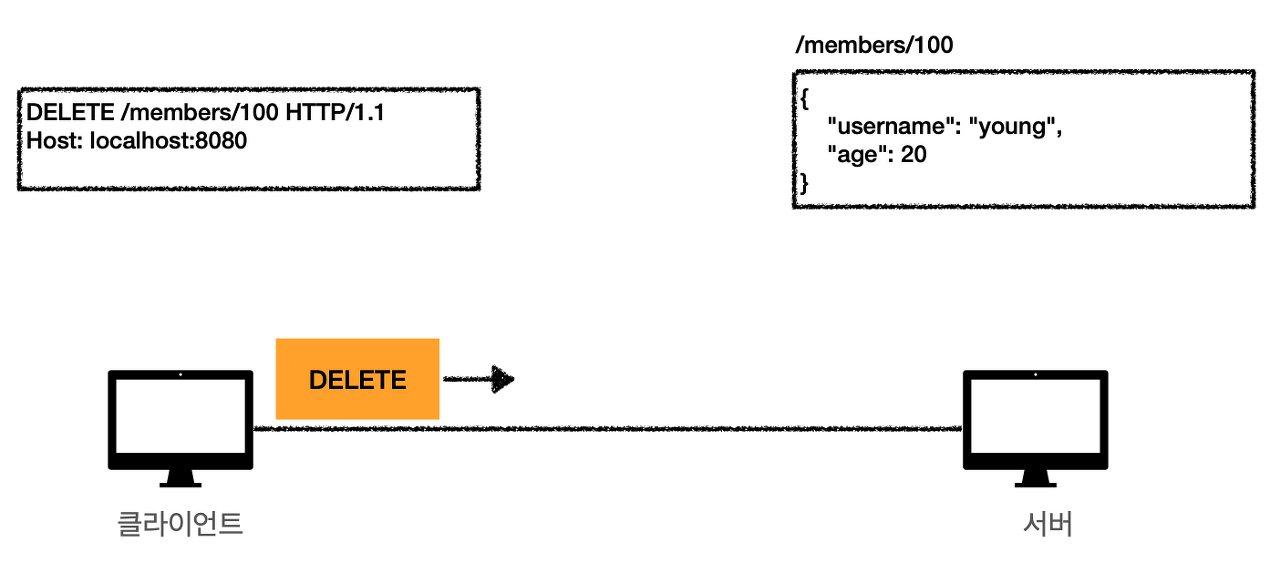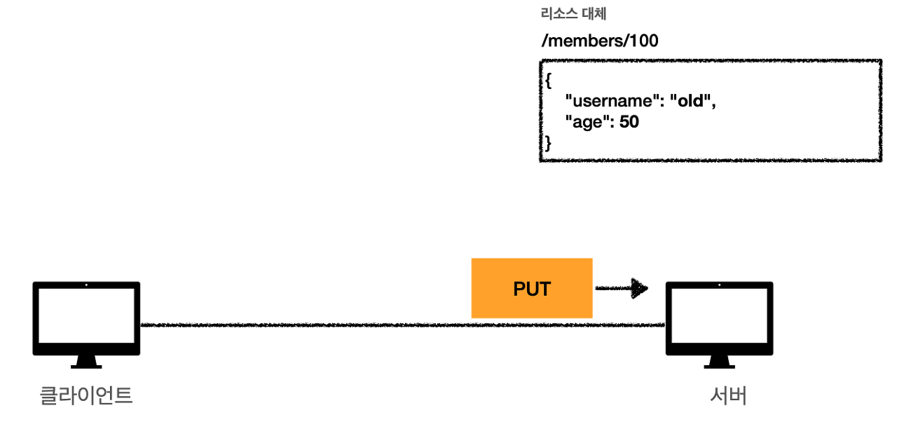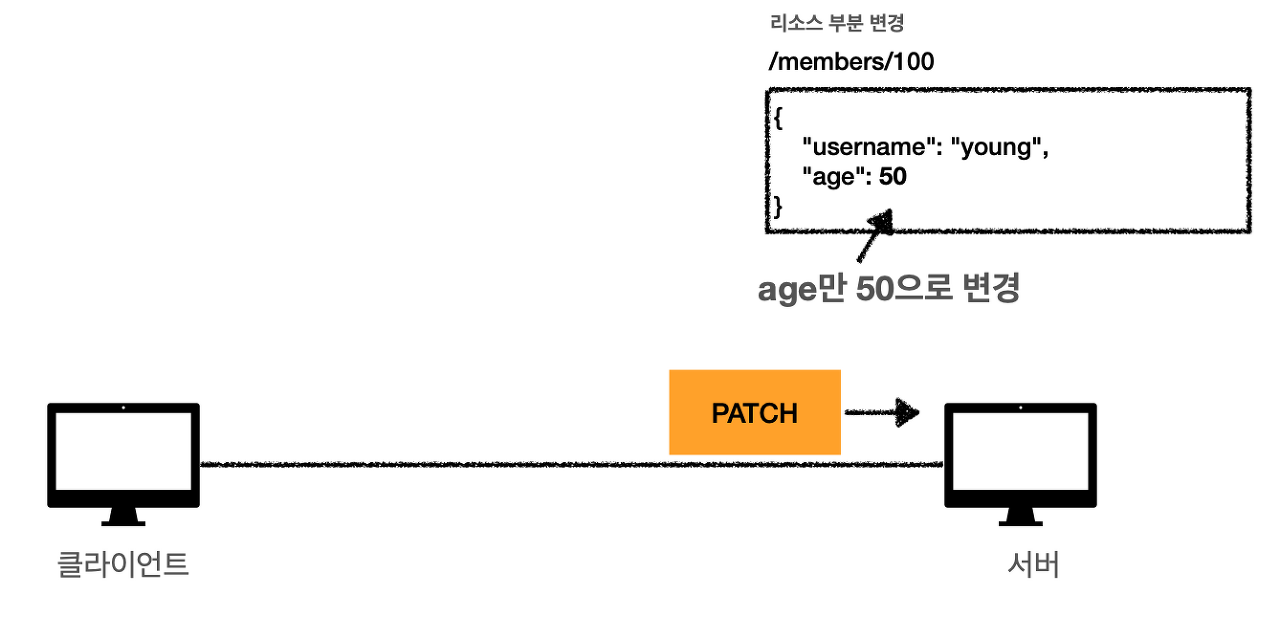 참고로 클라이언트가 /members/100 데이터에 username이 없고, age로 지정해서 보내게 되면 서버에서는 age를 업데이트 하는데 username이 날아가버린다. 기존 리소스를 새로운 리소스로 완전히 대체하기 때문에 리소스를 수정하기 어렵다.