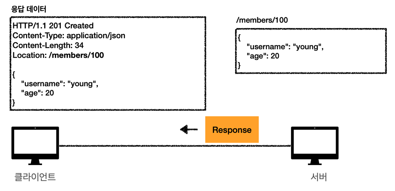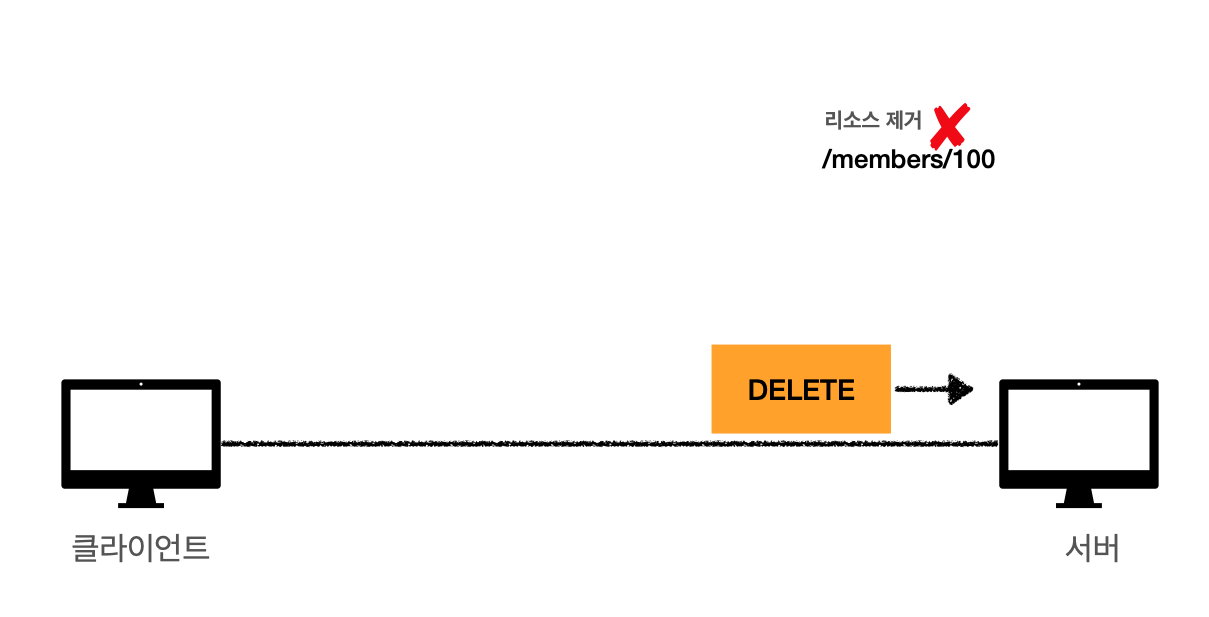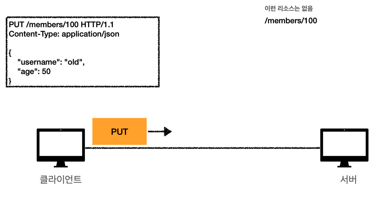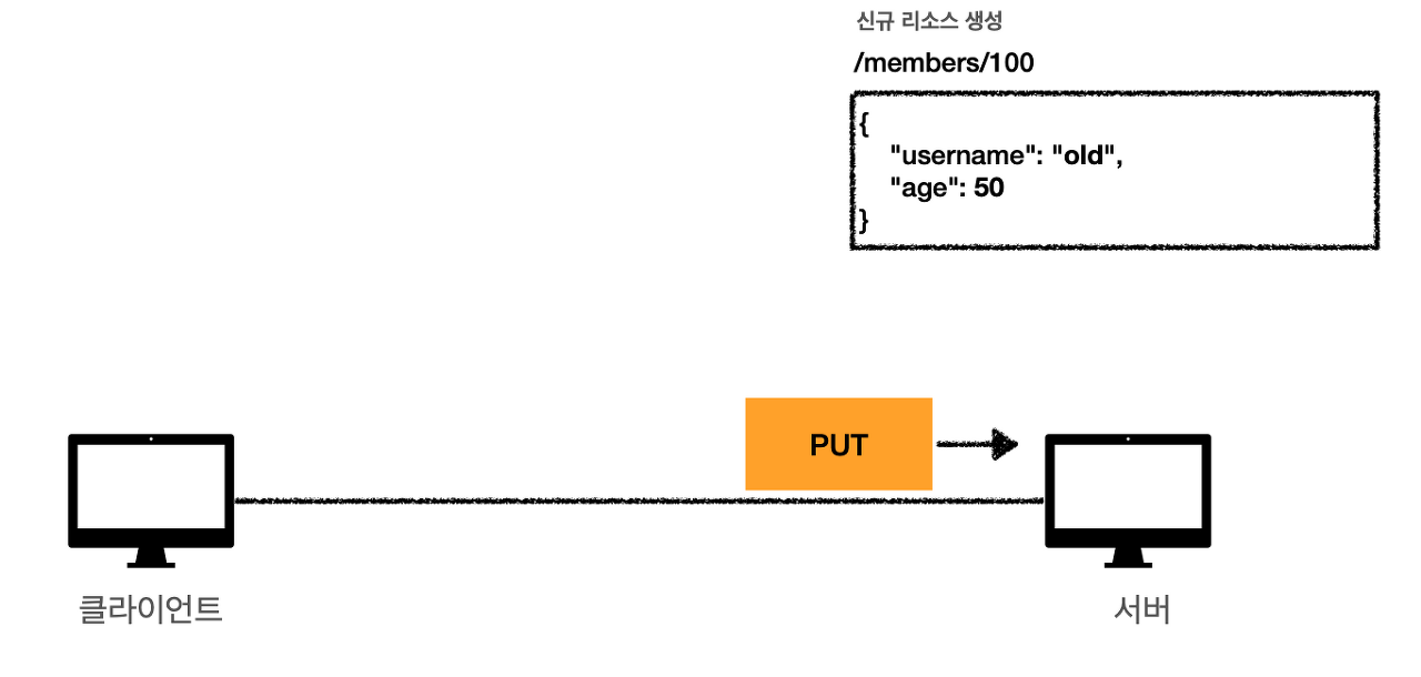 클라이언트에서 /members/100 으로 리소스를 지정해서 데이터를 서버에게 보내게 되면 서버에 해당 리소스가 없어서 신규 리소스로 생성이 된다.
